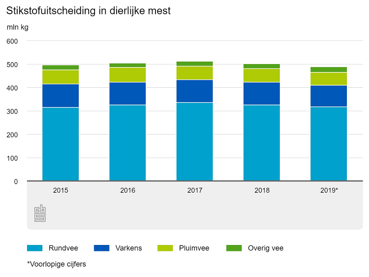 De stikstofuitscheiding in dierlijke mest is in 2019 vergeleken met een jaar eerder met 2,6 procent gedaald naar 490 miljoen kilogram. Dat is onder het stikstofplafond dat de Europese Unie heeft vastgesteld voor de Nederlandse veestapel. De fosfaatuitscheiding bedroeg tegelijkertijd 156 miljoen kilogram, 3,7 procent minder dan in 2018.