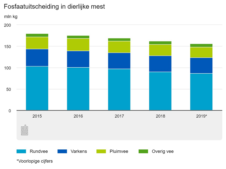 De fosfaatuitscheiding daalde in 2019 met 6,0 miljoen kilogram, een afname van 3,7 procent vergeleken met een jaar eerder. De hoeveelheid fosfaat in dierlijke mest is voor het derde achtereenvolgende jaar gedaald en ligt nu 17 miljoen kilogram (10 procent) onder het fosfaatplafond van 172,9 miljoen kilogram dat door de Europese Unie is vastgesteld.