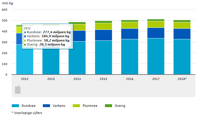 De melkproductie per melkkoe is toegenomen van ruim 8 300 kilo in 2016 tot 8 850 kilo in 2018. Ook het voerverbruik per melkkoe is gestegen. Door het toegenomen voerverbruik en een afnemend areaal snijmaïs zit er de laatste jaren naar verhouding meer gras en krachtvoer in het rantsoen van koeien. Gras en krachtvoer bevatten tot drie keer meer stikstof dan snijmaïs waardoor de stikstofuitscheiding per koe is toegenomen. Daarnaast is ook het stikstofgehalte van gras de laatste jaren toegenomen. Om deze redenen neemt de totale stikstofuitscheiding ondanks verkleining van de veestapel nauwelijks af.