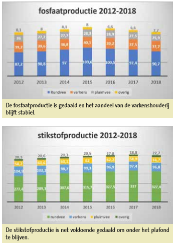De fosfaatproductie van de melkveesector bedroeg daardoor vorig jaar 78,7 miljoen kilogram, 8,0 miljoen kilogram minder dan in 2017. De fosfaatproductie in de melkveesector ligt daarmee 7 procent onder het fosfaatplafond voor deze sector (84,9 miljoen kilogram). De fosfaat productie van vleesrundvee was 12,1 miljoen kilogram, 12 procent meer dan een jaar eerder. De fosfaatproductie en de stikstofuitscheiding van varkens lagen in 2018 vrijwel op hetzelfde niveau als in 2017. Het aantal vleesvarkens en zeugen daalde heel licht maar het effect van die daling werd tenietgedaan door een lichte toename van het fosforgehalte van het voer. De fosfaatproductie van de varkenssector kwam in 2018 uit op 37,7 miljoen kilogram en de stikstofuitscheiding op 96,8 miljoen kilogram. De fosfaatproductie en de stikstofuitscheiding in de varkenshouderij liggen sinds 2016 onder de productieplafonds van 39,7 miljoen kilogram fosfaat en 99,1 miljoen kilogram stikstof.