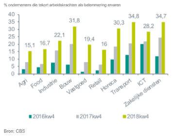 Dan de kanttekening: de groei wordt geremd, waardoor de sectoren, evenals het bruto binnenlands product (bbp), in 2019 minder hard groeien dan in 2018. De begrotingsperikelen in Italië, de chaotische Brexit en de handelsoorlog tussen China en de VS voeden de onzekerheid. Dichterbij huis gooit de krapte op de arbeidsmarkt, die inmiddels chronische vormen lijkt aan te nemen, extra olie op het vuur. Het aantal openstaande vacatures neemt kwartaal op kwartaal toe, zo blijkt uit cijfers van het Centraal Bureau voor de Statistiek (CBS). De schaarste aan specifieke beroepsgroepen neemt toe. Programmeurs krijgen elke maand verzoeken om elders aan de slag te gaan. Hoe minder snel die vacatures worden opgevuld, hoe meer pijn het gaat doen.