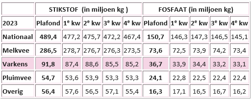 De mineralen-uitscheiding van alle veehouderijsectoren zit onder het nationale plafond van 489,4 miljoen kilo stikstof en 150,7 miljoen kilo fosfaat. De varkenssector zit met een excretie van 33,1 miljoen kilo (4e kwartaal) bijna 10 procent onder het fosfaatplafond van 36,7 miljoen kilo. De stikstofuitscheiding ligt op 85,2 miljoen kilo en daarmee 7 procent onder het stikstofplafond van 91,8 miljoen kilo.