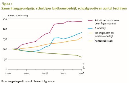 Bij een kostenefficiënte productie van bulkgoederen hoort bijvoorbeeld specifiek veevoer, een hoogtechnologische melkrobot, of technologie die de lucht in de stallen zuivert. Hierdoor is de gespecialiseerde boer sterker afhankelijk geraakt van gespecialiseerde voerleveranciers en specifieke technologiebedrijven. Zonder leveranciers, afnemers, financiers, adviseurs, loonwerkers, en specialistische kennis is het veelal onmogelijk mee te komen op de internationale markten waar de meeste boeren direct of indirect voor produceren. Via deze ontwikkelrichting zijn ontegenzeggelijk grote efficiëntiewinsten geboekt. De productie is opgeschroefd, terwijl de kosten en de milieudruk per eenheid product zijn gedaald. Boereninkomens profiteren echter maar beperkt van die efficiëntiewinst en blijven in grote delen van de landbouw onder druk staan (figuur 2).