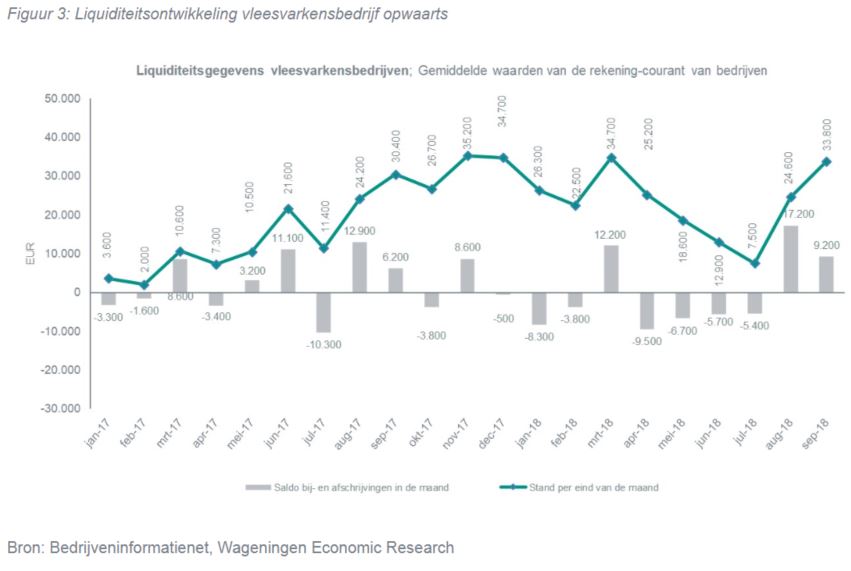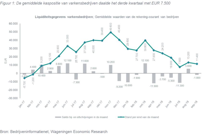 De rekening-courant positie van varkensbedrijven is in het derde kwartaal van 2018 met 7.500 euro gedaald ten opzichte van einde tweede kwartaal en kwam eind september uit op bijna 11.500 euro. November vorig jaar piekte deze nog tot een niveau van gemiddeld bijna 50.000 euro. De gestegen kosten van voer en mestafzet en de gedaalde opbrengsten voor vleesvarkens en biggen zijn de belangrijkste oorzaken.