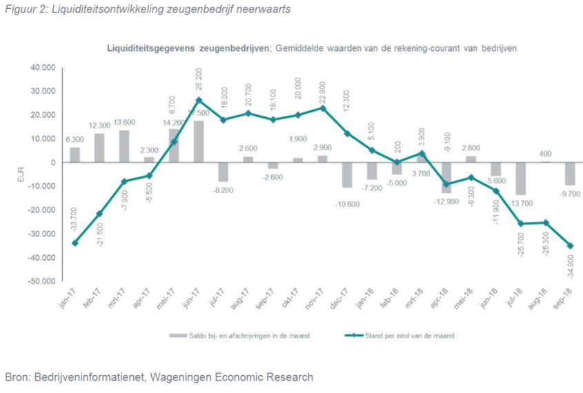Vooral zeugenbedrijven zagen hun rekening-courantpositie dalen als gevolg van de lage biggenprijzen. Ze komen 10 tot 20 euro per big tekort. Vleesvarkenshouders hebben dankzij de goedkopere biggen een compensatie voor de lage prijs van varkensvlees. Daardoor zien we dit derde kwartaal een tegengestelde liquiditeitsontwikkeling op zeugen- en vleesvarkensbedrijven.