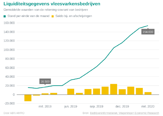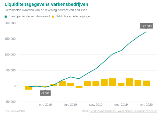 Vooral vanaf augustus vorig jaar is die ontwikkeling versneld. De vleesvarkensprijzen piekten in december en de biggenprijzen bereikten hun hoogste niveau in maart van dit jaar. Daardoor kochten vleesvarkensbedrijven dure biggen. De voerkosten in het eerste kwartaal zijn lager dan een jaar eerder maar zijn de afgelopen maanden wel iets opgelopen door hogere prijzen van veevoergrondstoffen op de wereldmarkt. De coronacrisis zorgt in maart voor verstoring van de wereldhandel en de marktprijzen van veevoergrondstoffen. De betaalde mestkosten daalden dit voorjaar ondanks de natte weersomstandigheden in januari en februari. De gunstige gang van zaken was voor een aantal bedrijven aanleiding voor meer investeringen in de periode oktober tot en met februari. Daardoor zijn vanaf oktober de stortingen van nieuwe kredieten/leningen toegenomen alsmede de betalingen ten behoeve van investeringen. De meeste bedrijven hebben hun crediteurenpositie inmiddels afgebouwd.