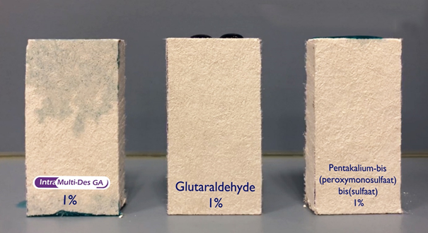 Bij het aanbrengen van een desinfectiemiddel door spuiten of vernevelen is het belangrijk om een kleine druppelgrootte te realiseren om alle hoeken van het te behandelen oppervlak te bereiken. Zodra een druppel het oppervlak raakt, moet hij homogeen vloeien om een maximaal oppervlak per druppel te bereiken en vrij stromen om alle verborgen plekken te bereiken (figuur 1). De foto's in figuur 2 laten duidelijk zien dat met Intra Multi-Des GA een groter oppervlak en een diepere penetratie wordt bereikt dan met glutaaraldehyde en een controleproduct dat in Azië op de markt is.