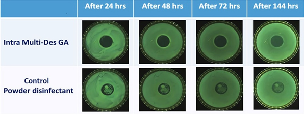 Vooral in gebieden met een warm klimaat, zoals in Azië, kunnen desinfectiemiddelen als ze opdrogen snel hun werkzaamheid verliezen. Met behulp van een stempeltest werd een 0,5% productoplossing gedroogd bij kamertemperatuur en gedurende 2 seconden gestempeld op met Pseudomonas aeruginosa besmette bacteriekweekplaten. Na 24-72 uur incubatie waren de kweekplaten volledig bedekt met bacteriën, behalve in het gebied dat gestempeld was met gedroogde Intra Multi-Des GA (figuur 3). Dit toont duidelijk aan dat zelfs na verdamping Intra Multi-Des GA in staat is om bacteriële groei voor de duur van ten minste 3 dagen te voorkomen, in tegenstelling tot een in Azië verkrijgbaar controleproduct dat bacteriële groei binnen 24 uur toeliet.